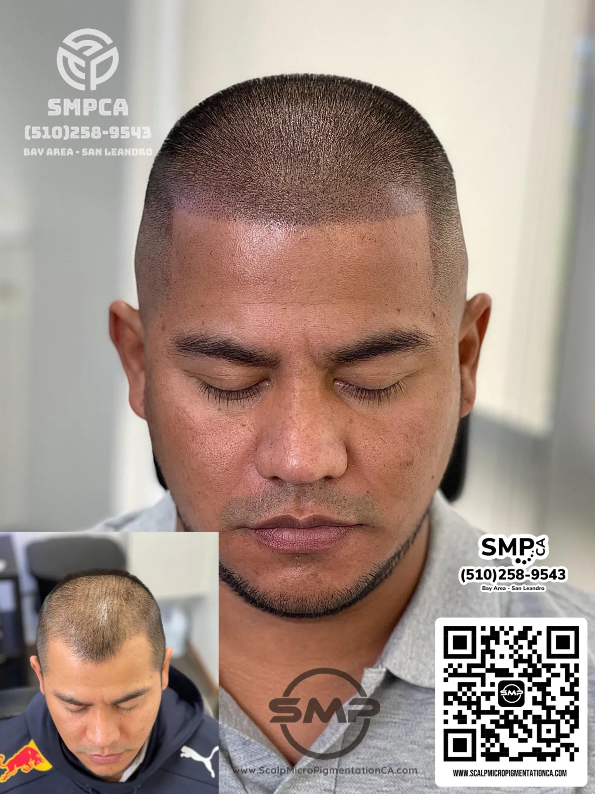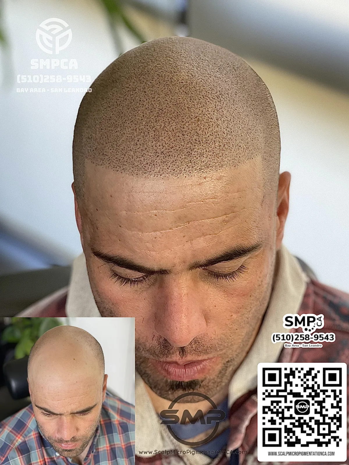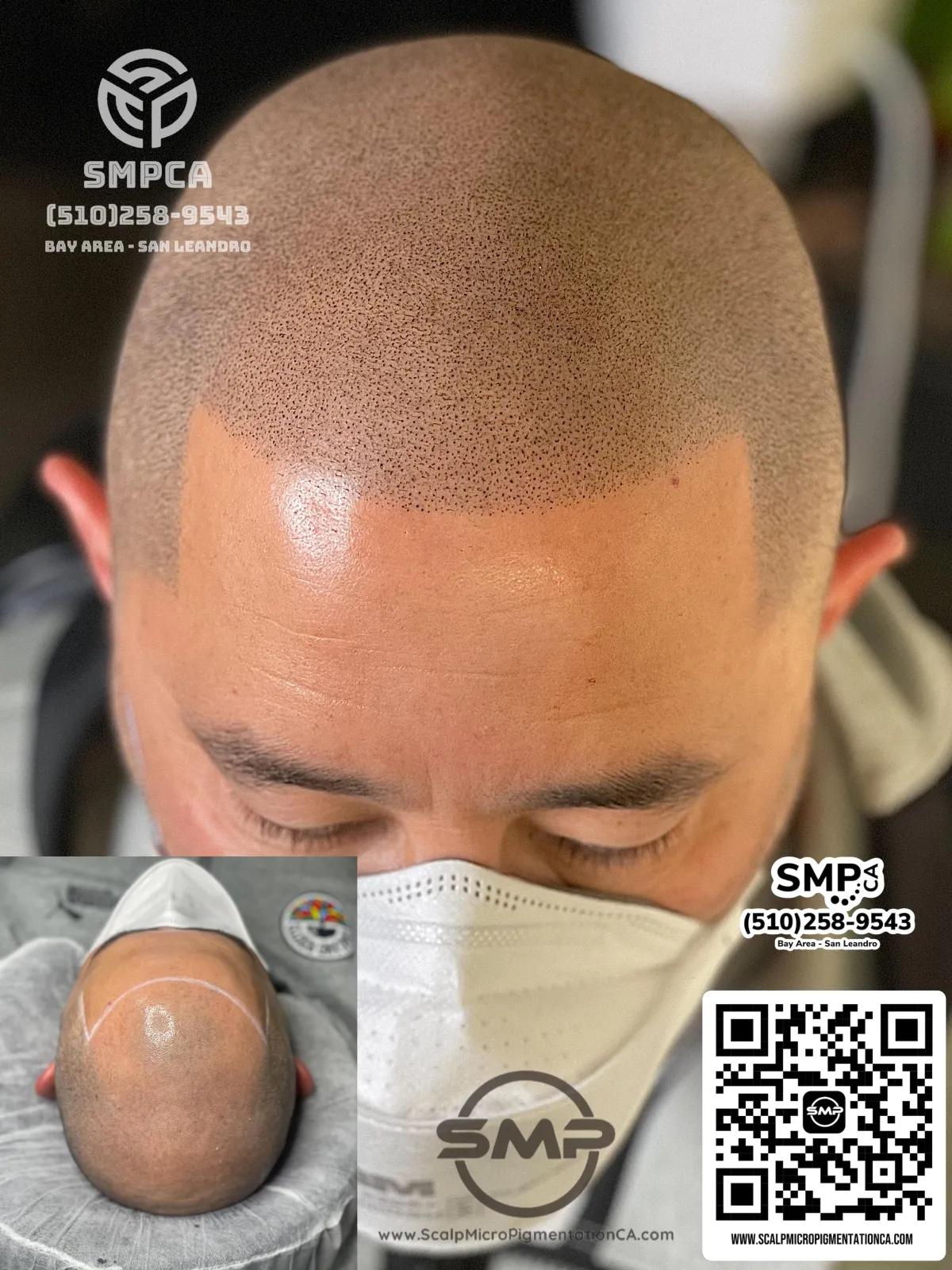 This cosmetic, non-surgical hair tattoo that gives the illusion of a close buzz cut hairstyle on a bald head. The treatment can also be used to conceal scars from a hair transplant or to treat hair loss through conditions such as alopecia. Scalp Micropigmentation treatment is often referred to as SMP, a hair tattoo or scalp tattoo.